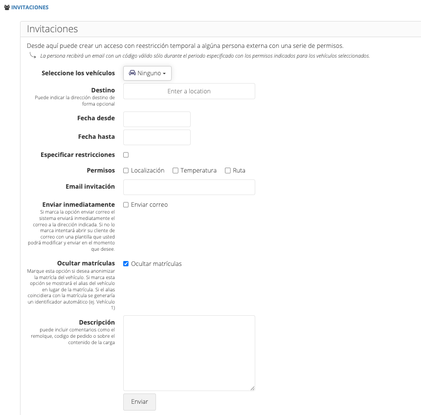 Desde esta pestaña, puedes crear invitaciones para tus clientes, que le permitirán ver a través de un enlace la localización del vehículo que indiques, así como la temperatura, ruta..