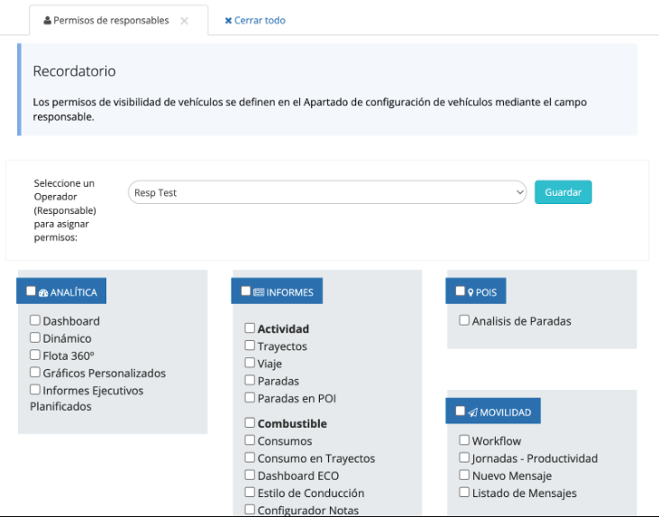 ✪Permisos de responsables en Fleetmanager. Puede personalizar los permisos de funcionalidades de la aplicación para cada responsable, dando mayor seguridad y control a la información que quiere que vean los responsables. Accesible desde Menú Configuración, sección General, Permisos responsables. Aplica a Fleetmanager