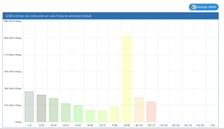 Podrá ver un gráfico de velocidades de la flota, que puede ser relevante para analizar consumos elevados. Posibilidad de seleccionar varios vehículos y un rango de días y exportar