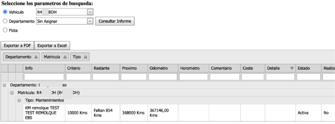 - Los informes disponibles en en pantalla incluyen información de periodo, nombre de vehículos, campo de búsqueda, selección de columnas, etc.