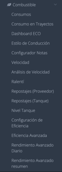 👍 reagrupamos los informes del antiguo módulo Ecodrive para vehículos ligeros: Consumo, Trayectos con consumo, Estilo de conducción, así como otros informes relacionados: Velocidad, análisis de velocidad, Dashboard de ECO