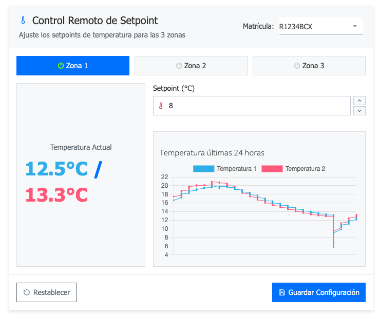 Debe seleccionar la matrícula y aparecerán las temperaturas. En caso de disponer de varias zonas en el remolque, la pestaña de cada zona estará en verde y podrá ajustar el setpoint para cada zona.